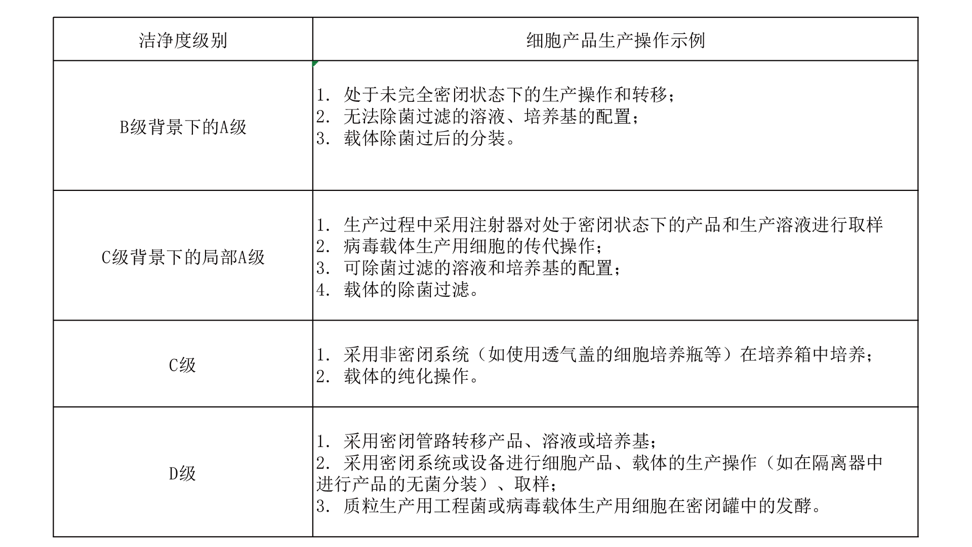目前細(xì)胞治療產(chǎn)品生產(chǎn)操作環(huán)境的潔凈度級(jí)別按照《藥品生產(chǎn)質(zhì)量管理規(guī)范——細(xì)胞治療產(chǎn)品附錄》可分為以下級(jí)別: